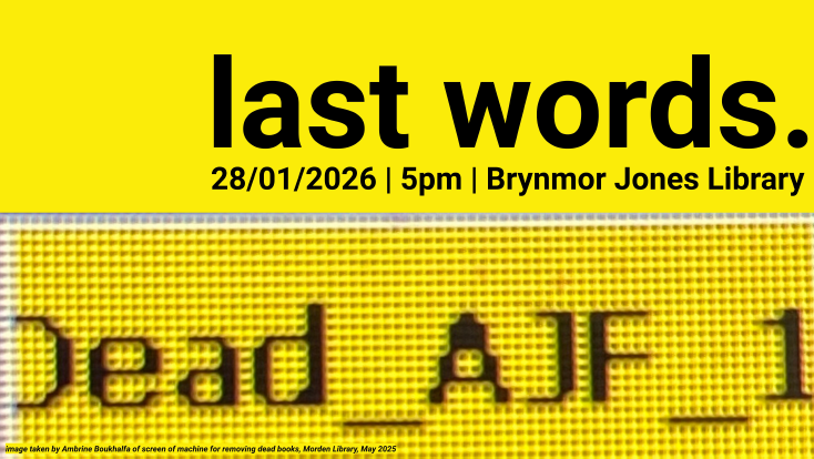 We will be gathering at the library in Skills Room 2 at 5pm where we will have a brief space for practising sound-making using voice, breath and word. We will then walk slowly for around 20-30 minutes while sounding the last words in different ways through indoor and outdoor spaces connected to the library. The performance will finish by 5.45pm. You are welcome to join us afterwards in the library cafe to relax and reflect after the performance. This is one of a series of Last Words performances over 2025-2026, all held in different libraries. The performance will be audio-recorded and a small part of it joined with recordings of the other performances, to sound the last words more widely.